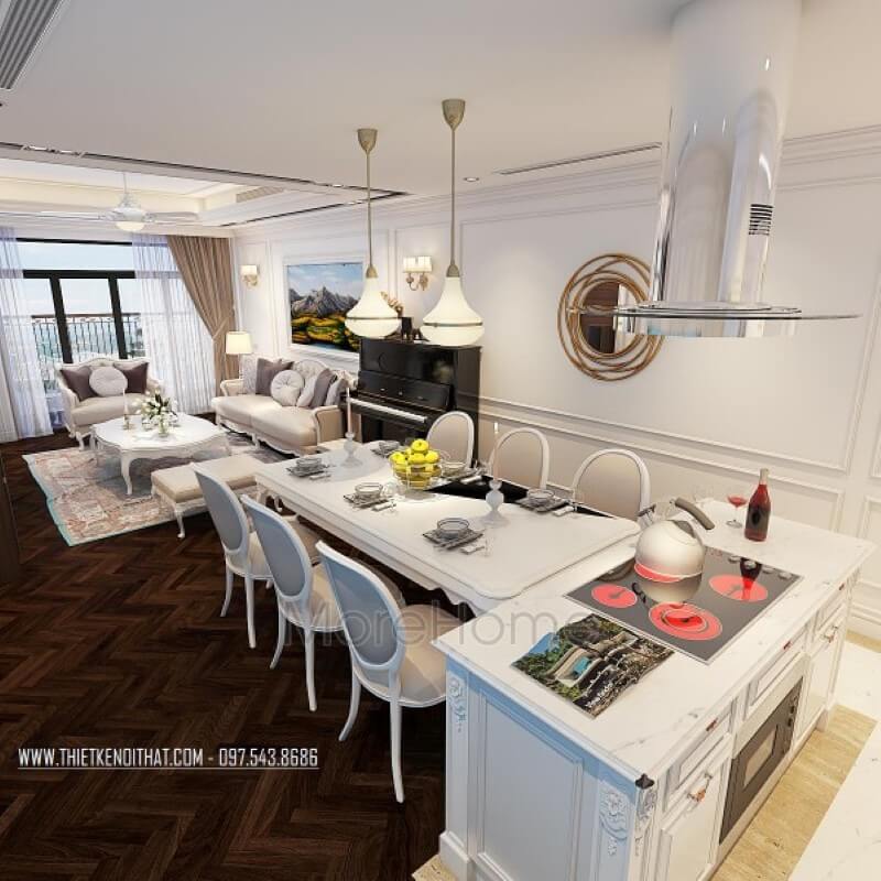 Sử dụng đá ốp mặt bếp màu trắng làm tăng thêm vẻ đẹp sang trọng cho không gian căn phòng