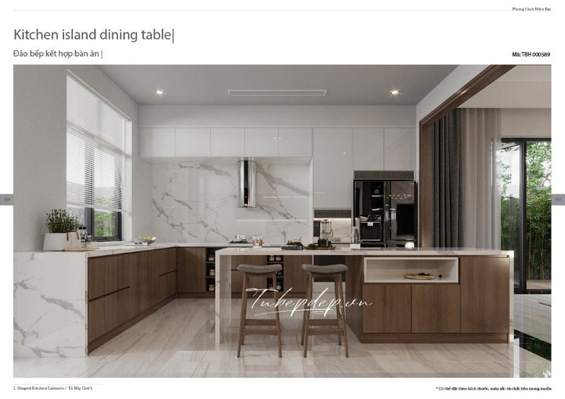 Mẫu thiết kế phòng bếp hiện đại trẻ trung được sử dụng nhiều đá trắng vân mây để ốp bàn, tường bếp. Bàn đảo là điểm nhấn thú vị không thể bỏ qua của phòng bếp này.