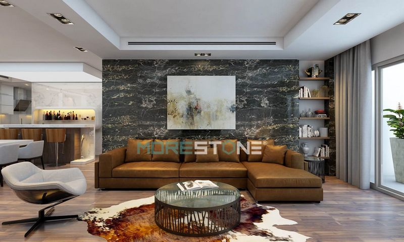 Các đá tự nhiên được sử dụng để làm điểm nhấn độc đáo cho phòng khách cao cấp bằng cách ốp lên tường.